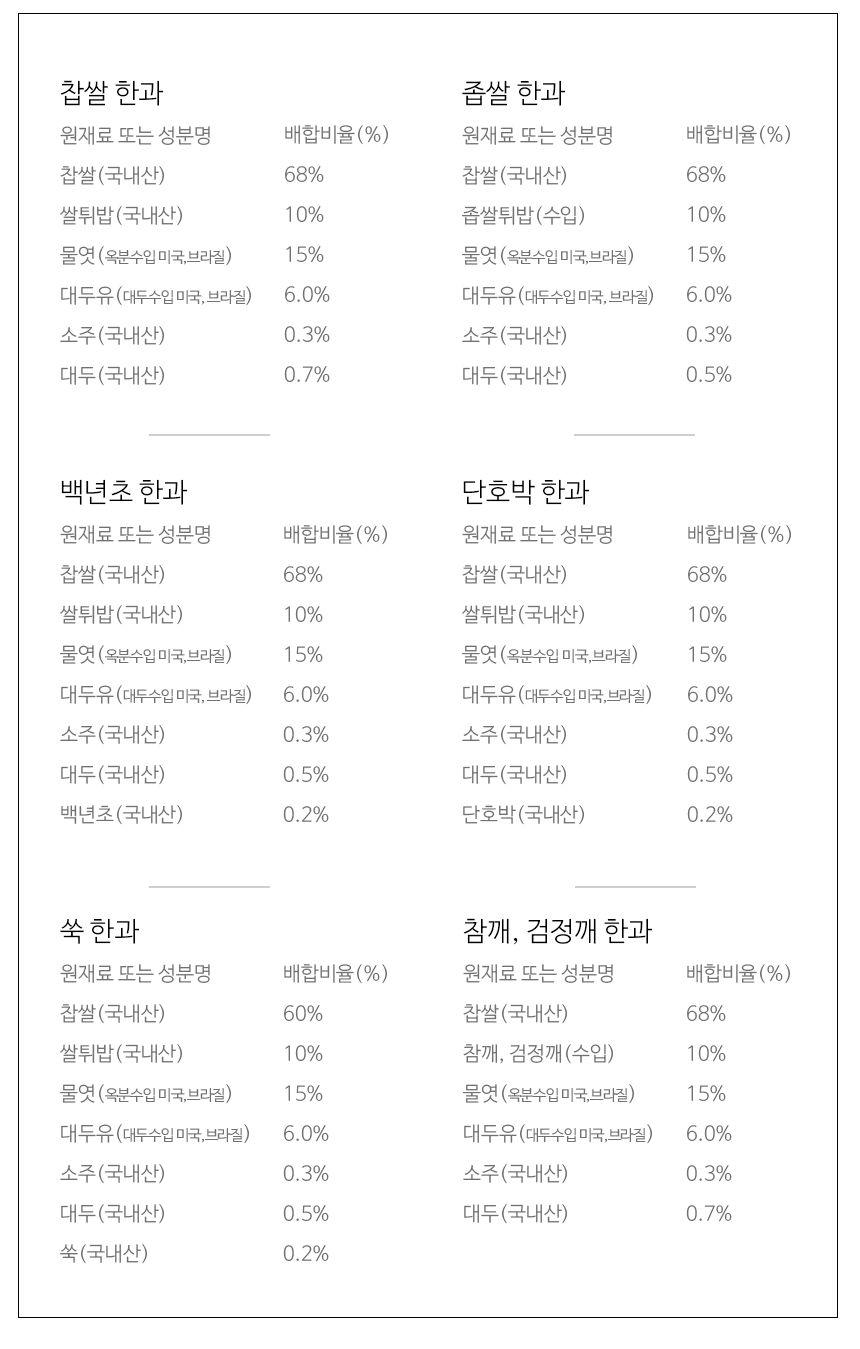 찹쌀한과, 좁쌀한과, 통밥한과와